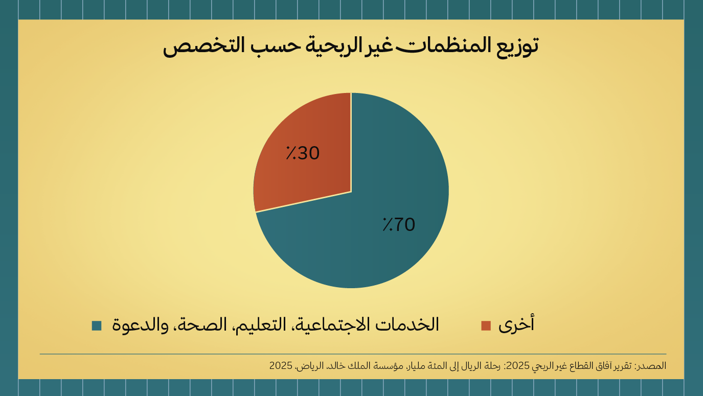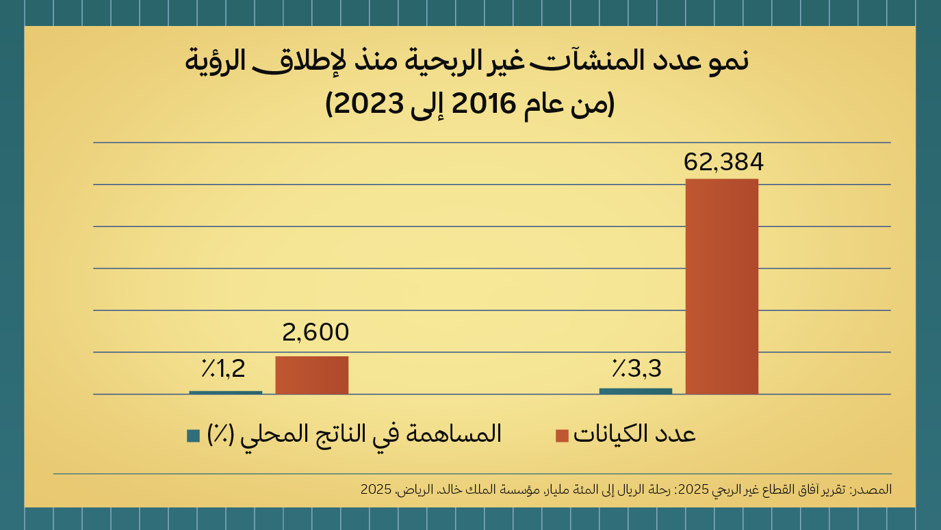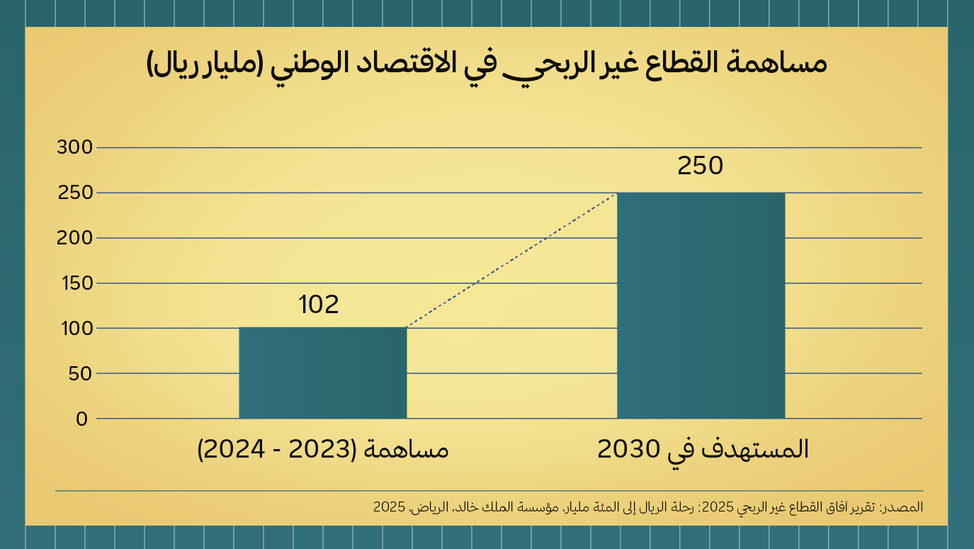 تجاوز القطاع غير الربحي حاجز 100 مليار ريال عام 2023. ومع ذلك، لا يزال حضور القطاع الخاص خجولًا؛ فالمبادرات في مجال الاستثمار الاجتماعي والخدمات وحاضنات الأعمال أو مسرّعاتها، لا تزال محدودة ولا تتناسب مع حجم الفرص المتاحة.