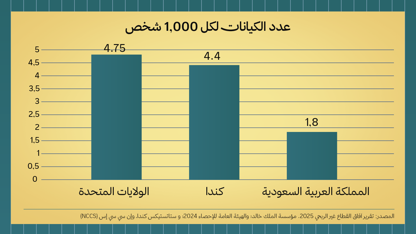 والواقع أننا، إذا قارنّا عدد الكيانات غير الربحية لكل ألف شخص في السعودية، نجده أقل بكثير من مثيلاتها في الدول المتقدمة. وهذا الفارق لا يعكس ضعفًا في الإمكانيات، بل فجوة في التأسيس.
