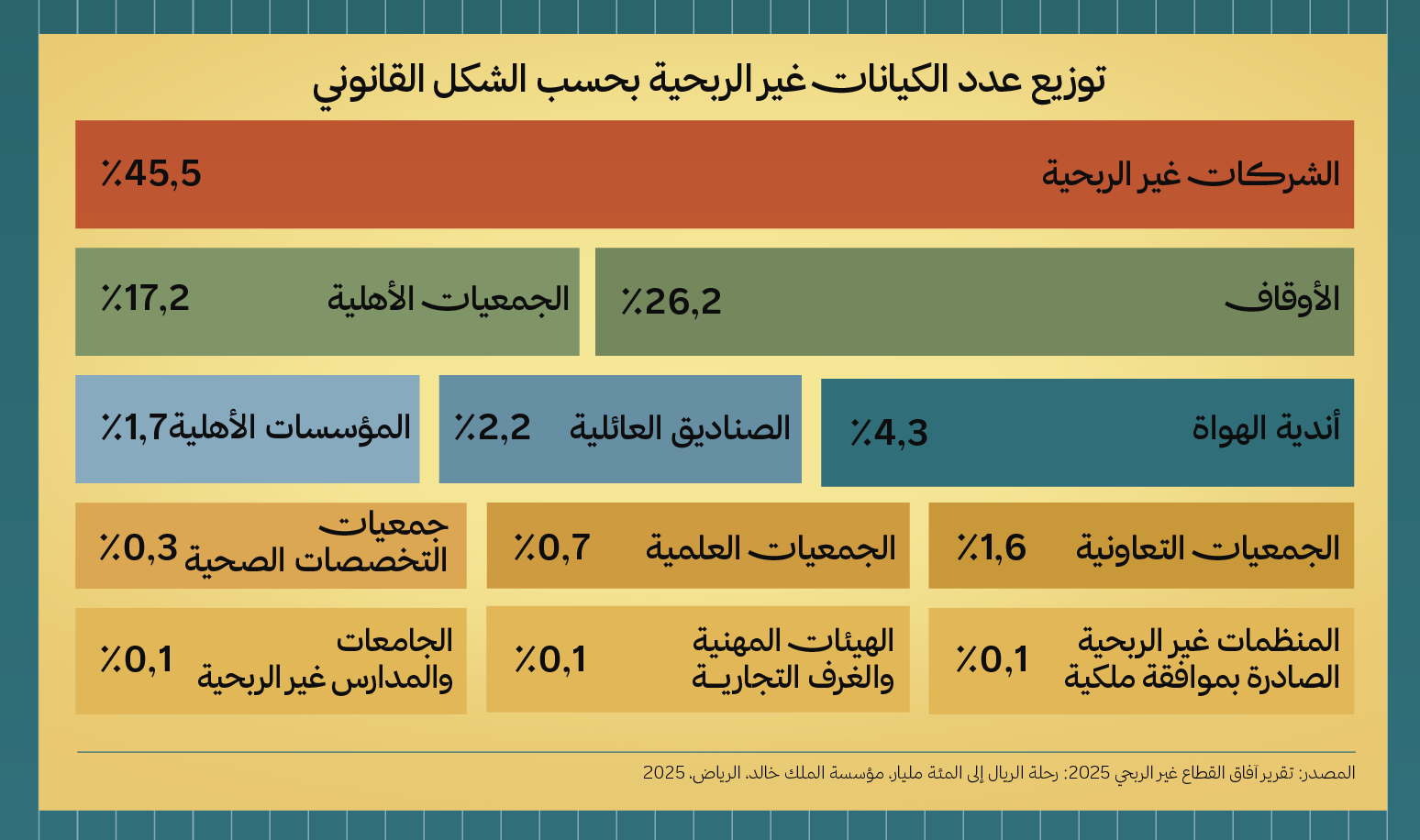 لدينا اقتصاد غير ربحي ينمو بسرعة، لكنه يفتقر إلى قاعدة تجارية مرنة تُترجم هذا الزخم إلى مشاريع مستدامة على الأرض. وأكثر من 70% من هذه الكيانات تتركّز في أربعة مجالات فقط، بينما تغيب تمامًا في مجالات مثل التقنية والابتكار والبيئة. وتُظهر بيانات الهيئة العامة للإحصاء أن الشركات غير الربحية أصبحت تشكّل 45.5% من إجمالي الكيانات في القطاع، متقدمةً على الجمعيات الأهلية والأوقاف، وهو مؤشر على التحول نحو نماذج مؤسسية أكثر احترافية واستدامة.