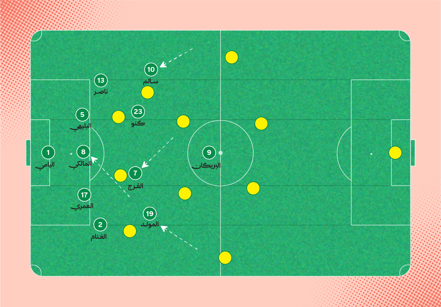 ومع استعادة الكرة، اعتمد المنتخب السعودي على التحول الهجومي السريع ومحاولة استغلال سرعة فهد المولد -شفاه الله- وسالم الدوسري إضافةً لوجود البريكان كنقطة يرتكز عليها المنتخب هجوميًا.