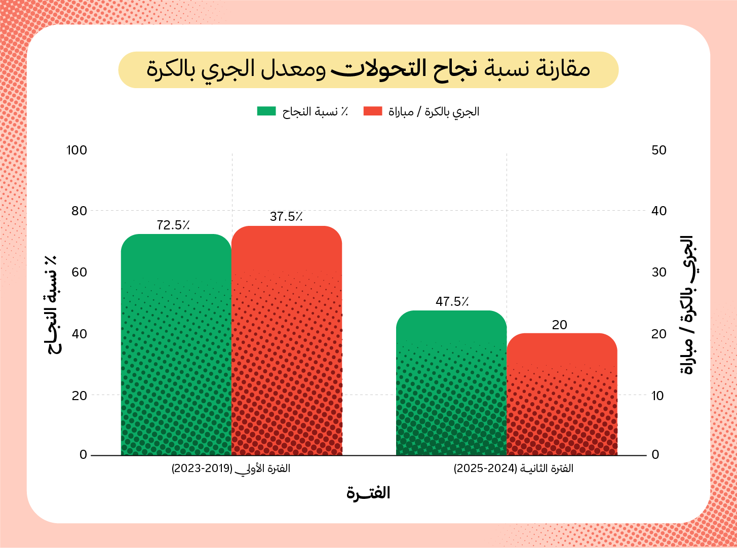 يتضح ذلك عند مقارنة معدلات الجري بالكرة ونسبة نجاح التحولات، إذ انخفضت نسبة التحولات من 30% - 18.5%، وانخفضت نسبة نجاحها من 72.5% - 47.5%، فيما انخفض معدل الجري بالكرة من 37.5 - 20 محاولةً، وانخفضت نسبة نجاح الجري من 67.5% - 52.5%، في حين انخفضت مسافة الجري بالكرة من 475 متر - 240 متر.