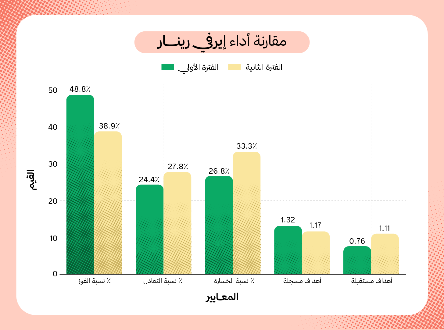 تعكس هذه الأرقام التوازن التكتيكي الذي اعتمد عليه رينار، حيث بلغ معدل الأهداف المسجلة (1.32 هدفًا) لكل مباراة، بينما معدل الأهداف المستقبلة (0.76هدفًا) فقط، وهو رقم دفاعي ممتاز يشير إلى صلابة الخط الخلفي.