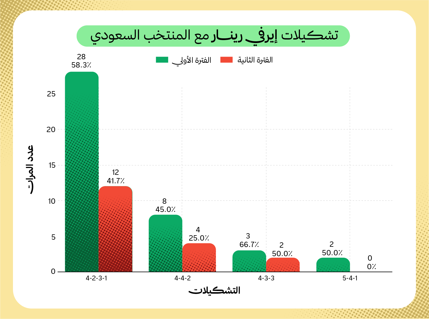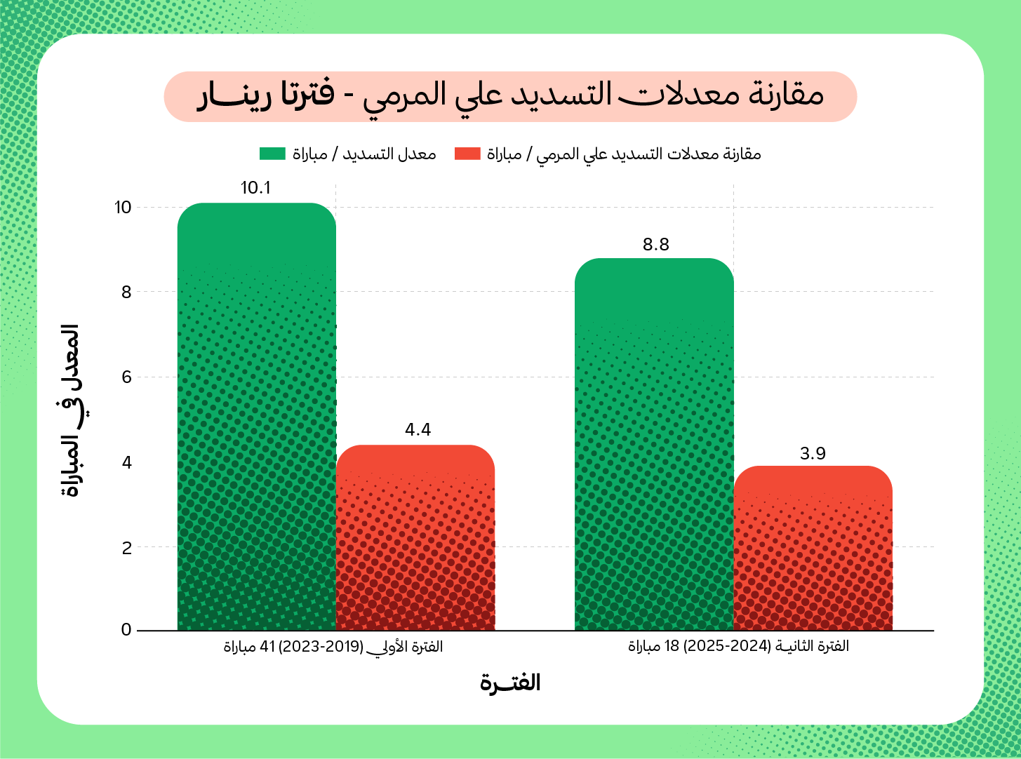 حيث انخفض المعدل من 53.2 لمسة/90 دقيقة إلى 6.8 لمسة/90 دقيقة بنسبة قاربت 87.3%، وهو انخفاض حاد يمثّل أخطر مؤشر إحصائي على تراجع الأداء الهجومي لفترة رينار الثانية.